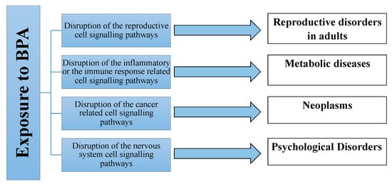 As already mentioned above, chronic exposure to low levels of BPA significantly affect biological systems through the disruption of hormonal homeostasis and cell signaling including, above all, inflammation or immune response-related, reproductive-related, cancer-related, and nervous system cell signaling pathways [19] (Figure 1).