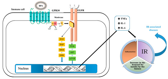 BPA activates GPR30. In the immune cells, GPR 30 mediated activation of MAPKs and PI3Ks pathways (through EGFR transactivation) induces the production of inflammatory cytokines; in turn, the inflammation worsen the IR, leading to an increase in the demand for insulin by tissues; this determines a consequent increase in inflammation with negative implications on peripheral insulin sensitivity, thus triggering a vicious circle.