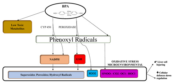 In this regard, a part of BPA-induced oxidative stress mechanisms have been recently clarified: while a majority of BPA is converted into less toxic metabolites, the remaining free BPA induces reactive oxygen species (ROS) production through the enzymatic (H2O2/peroxidase and NADPH/CYP450) and non-enzymatic (ONOO−/CO2 and −OCl/HOCl) reactions [37].