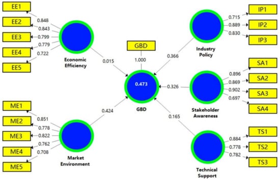 In order to establish a hypothetical partial least squares structural equation model (PLS-SEM), SmartPLS 3.2.8 software was used to perform measurement and structural model evaluation to analyze the impact of different components on GBD. The initial PLS-SEM is shown in Figure 1. The measurement items and structural models used in the figure are listed in Table 5. The two-step method recommended by C. Anderson and Gerbing [78] was adopted to analyze and interpret the results of the PLS-SEM: (1) The assessment of the outer measurement model; (2) the evaluation of the inner structure model.