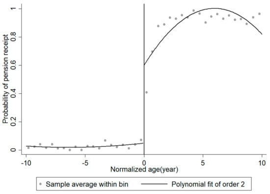 Pension receipt according to normalized age. Source: China Health and Retirement Longitudinal Survey (2015) []. Notes: Figure 1 describes the relationship between rate of pension receipt and respondents’ normalized age, using the sample of respondents aged between 50 and 70. The dots show the sample mean of the indicator variable for receiving a pension (1 if receiving pension, 0 otherwise) in each half year. The line is a polynomial fit of order 2.