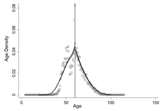 In order for the RD design to be valid, the distribution of age should not be determined in the presence of knowledge about the corresponding cut-point. Otherwise, it can be manipulated to include or exclude specific candidates. To investigate whether the density of age is continuous at the cut-off point of 60, the McCrary (2008) [] density test is employed. The test result is presented in Figure 2, showing no immediate jump after age 60.