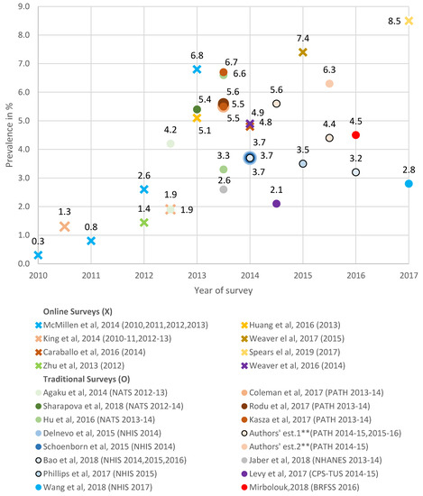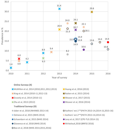 The prevalence of current e-cigarette/ENDS use among adult former smokers, online and traditional survey estimates, * 2010–2016. * The estimates from online surveys are indicated by an X, and the estimates from traditional surveys are indicated by a circle. The legend adopts the format “author’s name, publication year (survey name and year(s)),” and the names of all online surveys are omitted. For surveys that collected data over a two-year period, we plotted the estimates in the mid-period. ** Authors’ estimate one is measured by daily/nondaily ENDS use, and authors’ estimate two is measured by past-30-day ENDS use.