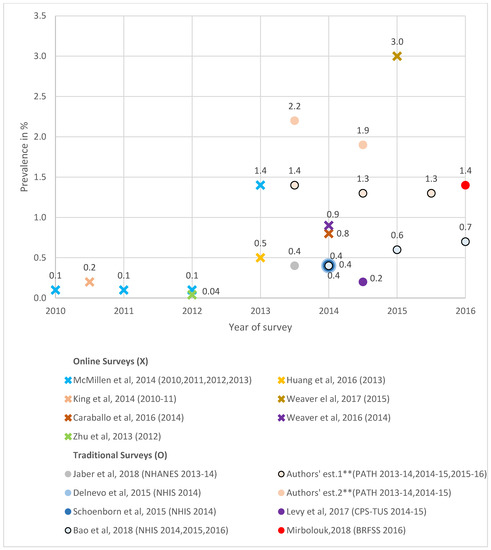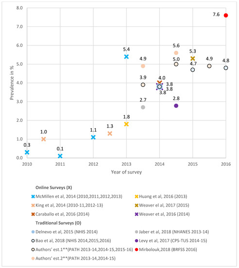 The prevalence of current e-cigarette/ENDS use among never smokers, online and traditional survey estimates *, 2010–2016. * The estimates from online surveys are indicated by an X, and the estimates from traditional surveys are indicated by a circle. The legend adopts the format “author’s name, publication year (survey name and year(s)),” and the names of all online surveys are omitted. For surveys that collected data over a two-year period, we plotted the estimates in the mid-period. ** Authors’ estimate one is measured by daily/nondaily ENDS use, and authors’ estimate two is measured by past-30-day ENDS use.