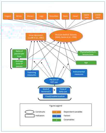 | Visual discomfort MSDs | ICT usage pattern TM1. Appropriate devices or equipment for the task being performed TM2. The company carried out a specific occupational hazard assessment for working with these devices TM3. Furniture that allows adopting an adequate posture to perform the task TM4. Lecterns, footrests, or other contributing elements to improve posture in front of the computer TM5. Accessory Element(s) (Lecterns, stands ...) in order to adopt an appropriate position when using smartphones/tablets TRM1. General training on prevention of occupational hazards TRM2. Training related to computer use TRM3. Training related to the use of other devices ICT usage pattern TM1 ICT usage pattern TM2 ICT usage pattern TM3 ICT usage pattern TM4 ICT usage pattern TM5 ICT usage pattern TRM1 ICT usage pattern TRM2 ICT usage pattern TRM3 | Age Physical activity outside the work setting Average pause time Ratio pauses per hour Average pause time ratio pauses per hour |
