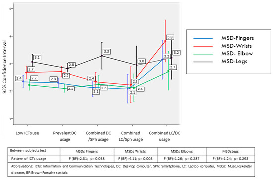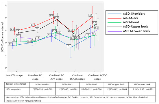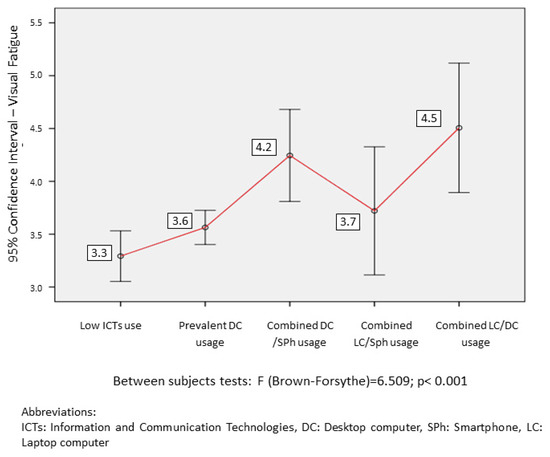 The results obtained are detailed more specifically in Figure 2, Figure 3 and Figure 4 and Table 7 and Table 8, which, in addition to the means of each group, provide the mean contrast statistics. To avoid the distortions linked to the non-homogeneity of variance between groups, the Brown-Forsythe statistic, a robust estimator of the difference of means unaffected by heteroscedasticity [15], was used. The figures show the relationship between ICT usage pattern, visual discomfort, and MSDs. The tables present the relation of these dependent variables with the other factors.