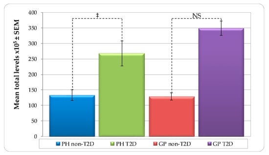 Mean total levels per group (total DNA-probe count × 105 ± SEM) of subgingival plaque samples from 178 non-T2D and T2D subjects (PH_non-T2D, n = 59; PH_T2D, n = 1; GP non-T2D, n = 67; and GP T2D, n = 38). Paired differences were determined by the Mann–Whitney test. The difference between the PH and GP non-T2D versus T2D were observed in each group. ‡ p < 0.001. NS—not significant.