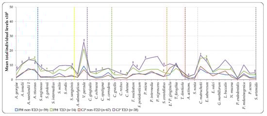 Figure 1 represents mean total levels of bacterial species (total DNA-probe count × 105 ± SEM) in all subject groups. T2D subjects harbored higher mean total levels than non-T2D in both PH and GP groups. However, the difference was statistically significant only in PH (PH—non-T2D 133.16 ± 17.72 versus T2D 268.01 ± 40.63, p < 0.001, and GP—non-T2D 128.77 ± 11.96 versus GP_T2D 349.25 ± 23.26, NS). No significant differences were detected between the PH and GP subjects with either non-T2D or T2D systemic conditions (Table S1).