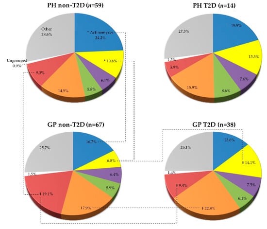 Our results indicated that while some differences could be detected consistently between the T2D and the non-T2D subjects, significant differences in subgingival microbial profiles were observed between both diabetic and periodontal groups. Subgingival plaque from T2D and non-T2D harbored significantly greater levels in the T2D groups (PH and GP), irrespective of the periodontal condition, this was considered the most important difference reported in a study of the T2D individuals with periodontitis [], but the main evidence to the present investigation was contradictory, with a particular microbiota of the T2D individuals. While some studies had reported similar subgingival microbiota in periodontitis of T2D and non-T2D individuals [,], contradictory recent reports using molecular techniques, have suggested that specific microorganisms, including the “non-periodontal pathogenic” species S. sanguinis, S. oralis, S. intermedius, and Actinomyces sp. harbor higher levels or prevalence in subgingival plaque of T2D individuals [,]. The results of the present study are in accordance with those last reports, with a predominance of levels, prevalence, and proportion of Actinomyces sp. and Streptococcus sp. in T2D groups (in PH and GP), compared to the non-T2D one. Therefore, our findings suggested a distinct subgingival microbial profile for T2D individuals, with few differences between PH and GP.