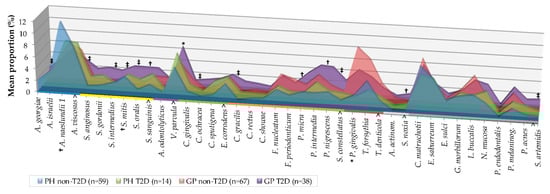 Mean individual proportions of the 40 evaluated species are summarized in Figure 4. Subjects with GP_T2D exhibited significantly higher proportions than the non-T2D of species A. georgiae, S. anginosus, S. intermedius, Streptococcus mitis, Streptococcus oralis (p < 0.001), S. sanguinis (p < 0.01), V. parvula (p < 0.05), C. ochracea, C. gracilis, S. constellatus (p < 0.001), P. micra, Prevotella nigrescens (p < 0.01), Selenomonas noxia (p < 0.01), and S. artemidis (p < 0.001) (Figure 4, Table S3). The statistically significant differences between the GP and PH subject in non-T2D were due to a higher proportion of “red” complex (p < 0.01), and P. gingivalis (p < 0.001) species, and a lower proportion of “Actinomyces” complex (p < 0.05), A. naeslundii (p < 0.01), “yellow” complex, and S. mitis (p < 0.05) species. No statistically significant differences were observed between PH and GP in the T2D individuals (Figure 3 and Figure 4) and between PH non-T2D and T2D (Table S3).