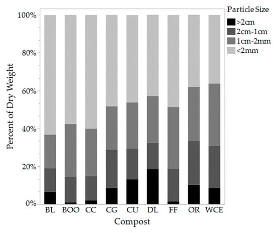 BL leaf compost was the finest in texture with 63.2% of the compost particles smaller than 2.0 mm, followed by CC with 60.1% smaller than 2.0 mm. OR and DL composts were the coarsest in texture with 33.5% and 32.3% of compost particles being larger than 1.0 cm, respectively (Figure 1).