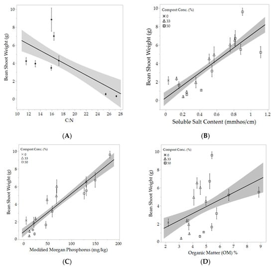 (A) shows the relationship between dry shoot weight of the bean plants and C:N ratio of eight of the nine compost types (excluding WCE). The black line represents the line of best fit; R2 = 0.359. (B) displays the relationship between dry shoot weight of the bean plants and soluble salts concentration of the amended and unamended soil for all compost types (excluding WCE); R2 = 0.570. (C) displays the relationship between extractable (available) phosphorus content of the amended and unamended treatments and bean dry shoot weight; R2 = 0.698. (D) displays the relationship between dry shoot weight of the bean plants and OM% of the amended and unamended treatments (excluding WCE); R2 = 0.157. The 100% compost treatments were excluded from Figure 2B–D for ease of interpretation. In all figures the shaded area denotes a 95% confidence interval. Each point represents the mean, error bars denote standard error (n = 6).