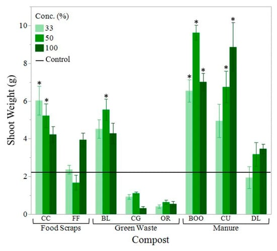 Mean bean plant dry shoot weight in grams by compost type. Compost concentration of the growing media shown from dark to light (100%, 50%, 33% compost). Horizontal solid black line indicates the mean shoot weight of the control (soil). Error bars denote standard error (n = 6). Stars (*) indicate significant difference from the control (α = 0.05).