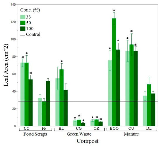 Mean bean plant leaf area in cm2 by compost type. Leaf area was taken for the second round of growth on bean plants. Compost concentration of the growing media shown from dark to light (100%, 50%, 33% compost). Horizontal solid black line indicates the mean shoot weight of the control (soil). Error bars denote standard error (n = 6). Stars (*) indicate significant from the control α = 0.05).