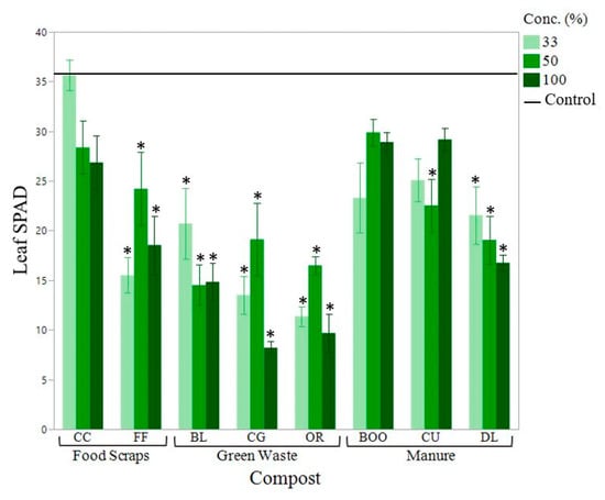 Mean bean leaf SPAD (greenness) by compost type. SPAD was taken using the second round of growth on bean plants. The mean of four separate measurements with the SPAD-meter was calculated for each plant. Compost concentration of the growing media shown from dark to light (100%, 50%, 33% compost). Horizontal solid black line indicates the mean shoot weight of the control (soil). Error bars denote standard error (n = 6). Stars (*) indicate significant from the control (α = 0.05).