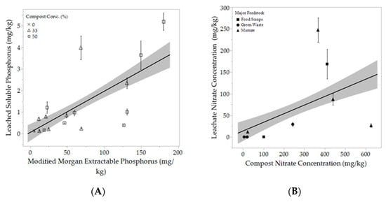 (A) displays the relationship between extractable (available) phosphorus content of the amended and unamended soil with concentration of soluble reactive phosphorus found in leachate. The black line represents the line of best fit; R2 = 0.417. The 100% compost treatment is excluded for ease of interpretation. (B) displays the relationship between nitrate concentration in the composts alone (100% compost). The manure-based compost in the lower left-hand corner is the WCE poultry manure compost which leached very little nitrate because the nitrogen in the compost was primarily in the form of ammonium. The black line represents the line of best fit; R2 = 0.145. In both graphs the shaded area denotes a 95% confidence interval. Each point represents the mean, error bars denote standard error (n = 6).