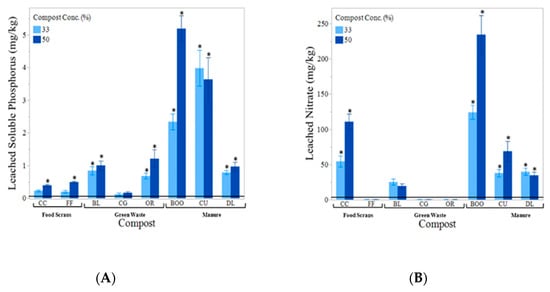 (A) shows mean soluble phosphorous found in leachate by compost type. Compost concentration of the growing media shown from light to dark (33% and 50%compost). The horizontal solid black line indicates the mean soluble phosphorus found in the leachate from the control (soil) equaling 0.122 mg/kg. (B) shows mean soluble Nitrate found in leachate by compost type. The horizontal solid black line indicates the mean nitrate found in the leachate from the control (soil) equaling 5.91 mg/kg. WCE compost and 100% compost concentration were excluded from both graphs. Error bars denote standard error (n = 6). Stars (*) indicate significant from the control (α = 0.05).