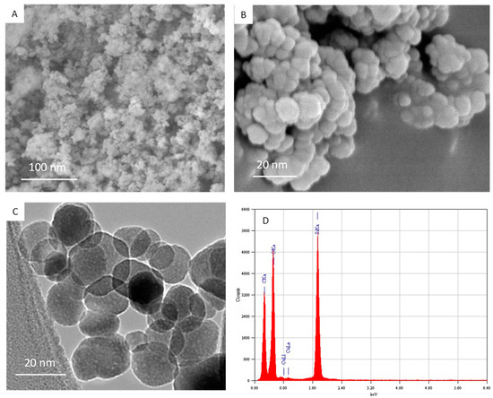 Characterization of nSiO2. (A,B) SEM images of nSiO2. (C) TEM image of nSiO2. (D) Elemental composition of nSiO2 analyzed by energy dispersive X-ray spectroscopy (EDS).