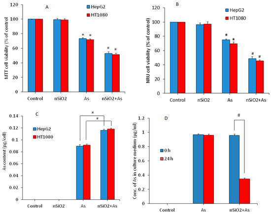 Cytotoxicity of HepG2 and HT1080 cells exposed for 24 h to silica nanoparticles (nSiO2) (10 µg/mL), As (1 µg/mL) or SiO2 + As (10 µg/mL + 1 µg/mL). (A) 3-(4, 5-dimethylthiazol-2-yl)-2, 5-diphenyltetrazoliumbromide (MTT) assay. (B) Neutral red uptake (NRU) assay. (C) Intracellular level of As in HepG2 and HT1080 cells exposed to nSiO2 (10 µg/mL), As (1 µg/mL) or SiO2 + As (10 µg/mL + 1 µg/mL) for 24 h. (D) Adsorption of As on the surface of nSiO2 in culture medium. Data are presented as the mean ± SD of three independent experiments (n = 3). * indicates significant effect in comparison to the control group (p < 0.05). # indicates significant effect in comparison to nSiO2 group alone or As group alone (p < 0.05).