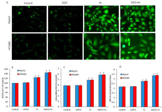 Oxidative stress is one of the potential mechanisms through which nanoparticles exert toxicity to human cells [45]. Heavy metals and metalloids also have potential to induce toxicity through the disturbance of redox homeostasis [46]. Hence, we further evaluated the combined effects of nSiO2 and As on several parameters of oxidative stress in HepG2 and HT1080 cells exposed to nSiO2 and/or As for 24 h. The ROS, H2O2 and MDA were assayed as pro-oxidant markers. Microscopic data have shown that ROS level (DCF fluorescence) in nSiO2 was not different from the control group (Figure 3A). However, DCF fluorescence intensity (ROS level) was increased in the As group compared to those of the control group. Interestingly, DCF fluorescence intensity in the co-exposure group (nSiO2 + As) was more pronounced than those of the As group alone (Figure 3A). In agreement with microscopy data, quantitative data have also shown that ROS level in the nSiO2 group was similar to the control group, but was significantly higher in As group in comparison to the control group (Figure 3B) (p < 0.05). Interestingly, ROS level was significantly increased in the co-exposure group (nSiO2 + As) in comparison to the As group alone (Figure 3B) (p < 0.05). Combined effects of nSiO2 and As were further examined through H2O2 and MDA levels. Figure 3C,D demonstrated that H2O2 and MDA levels in nSiO2 group were not different from the control group, but significantly higher in the As group. Again, H2O2 and MDA levels in the co-exposure group (nSiO2 + As) were significantly higher in comparison to the As group alone (p < 0.05). These data suggested that co-exposure of nSiO2 and As exacerbated the oxidative damage of HepG2 and HT1080 cells than those of the As exposure alone.