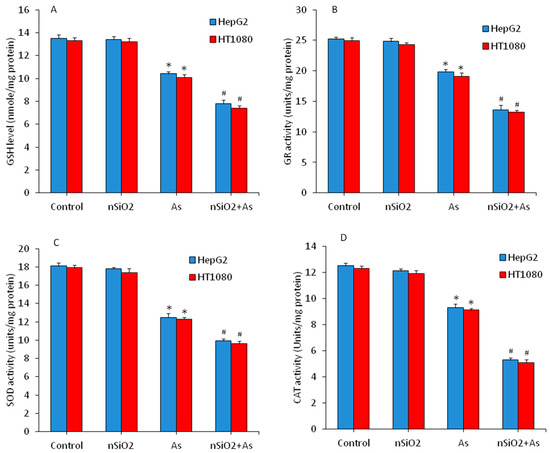 Antioxidant levels in HepG2 and HT1080 cells after exposure to nSiO2 (10 µg/mL), As (1 µg/mL) or SiO2 + As (10 µg/mL + 1 µg/mL) for 24 h. (A) Intracellular glutathione (GSH) level. (B) Glutathione reductase (GR) enzyme activity. (C) Superoxide dismutase (SOD) enzyme activity. (D) Catalase (CAT) enzyme activity. Data are presented as the mean ± SD of three independent experiments (n = 3). * indicates significant effect in comparison to the control group (p < 0.05). # indicates significant effect in comparison to the nSiO2 group alone or As group alone (p < 0.05).