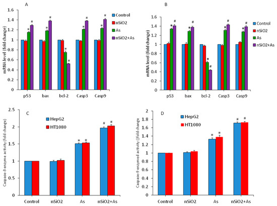 Expression of apoptotic genes and enzymes in HepG2 and HT1080 cells exposed for 24 h to nSiO2 (10 µg/mL), As (1 µg/mL) or SiO2 + As (10 µg/mL + 1 µg/mL). (A) mRNA level of apoptotic genes in HepG2 cells. (B) mRNA level of apoptotic genes in HT1080 cells. (C) Activity of caspase-3 enzymes. (D) Activity of caspase-9 enzymes. Data are presented as the mean ± SD of three independent experiments (n = 3). * indicates significant effect in comparison to the control group (p < 0.05). # indicates significant effect in comparison to the nSiO2 group alone or the As group alone (p < 0.05).