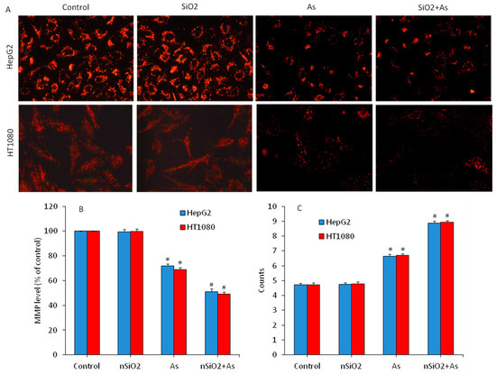 Decreased mitochondrial membrane potential (MMP) is also linked with apoptotic cell death [54,57]. We further evaluated the MMP level in HepG2 and HT1080 cells exposed for 24 to nSiO2 and/ or As. Figure 6A showed that fluorescent intensity of Rh-123 (indicator of MMP level) in the nSiO2 group was almost similar to the control group. However, the MMP level was significantly decreased due to As exposure (p < 0.05). Moreover, MMP depletion in the co-exposure group (nSiO2 + As) was more pronounced as compared to the As group alone (p < 0.05). Similar to microscopy data, quantitative analysis also demonstrated that MMP level in the nSiO2 group was not different from the control group (Figure 6B) but significantly decreased in the As group. Again, MMP loss in the co-exposure group (nSiO2 + As) was more pronounced than those of the As group alone (p < 0.05) (Figure 6B). A recent study shows that the non-cytotoxic concentration of nSiO2 significantly aggravates Pb-induced up-regulation of bax, caspase-3 and caspase-9 proteins, and down-regulation of bcl-2 protein along with MMP loss in human lung (A549) cells [27].