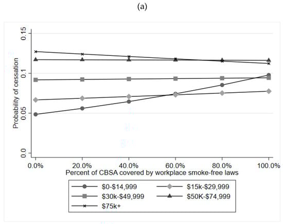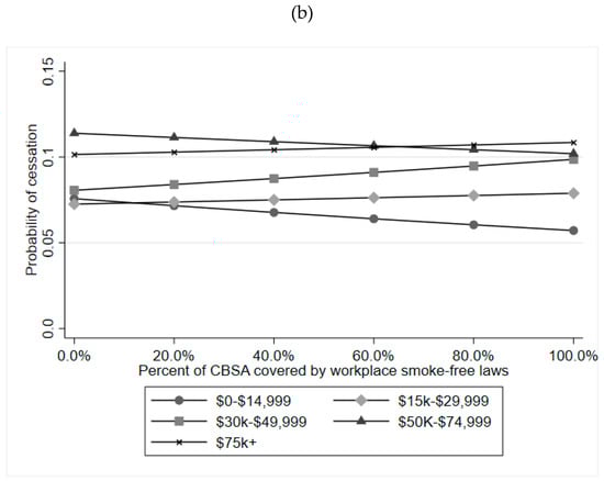 Predicted probability of cessation associated with workplace smoke-free law coverage by family income for (a) females and (b) males.