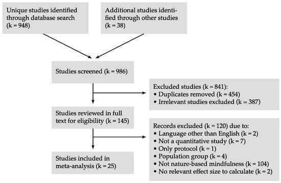 A total of 987 publications were identified: 949 through searches in databases, and 38 from other sources. After the screening of abstracts, 841 records were excluded, resulting in 146 full-text articles; of these, 120 were excluded, primarily due to a lack of relevant content on interventions (see Figure 1). Five authors were contacted for the data necessary to calculate an effect size. Three authors provided the data. In the fourth case, the effect size was set to zero, and the study was included. The last study was excluded due to a lack of information concerning the relevant outcomes. In total, 26 articles from 25 independent studies were included. Seven interventions with mindfulness in a natural setting were compared with a similar intervention without exposure to nature (i.e., active control). Seven studies compared interventions with groups in non-active control conditions (i.e., passive control), and 13 studies were evaluated as open trials.