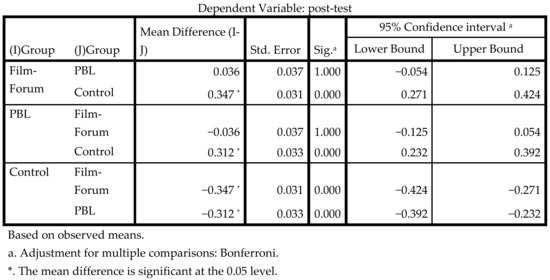 The comparison by course showed that after the intervention there were statistically significant differences in the level of knowledge of the fourth-year students compared to the third-year students (p = 0.000). By making a comparison by groups, the different interventions carried out were considered. The pairwise comparison showed that there were statistically significant differences (p = 0.000) between the two methodological interventions used with respect to the control group. However, no significance could be shown (p = 1.000) between film-forum and PBL. Both methodologies increased the level of knowledge, but there was no significant difference between them (Figure 4).