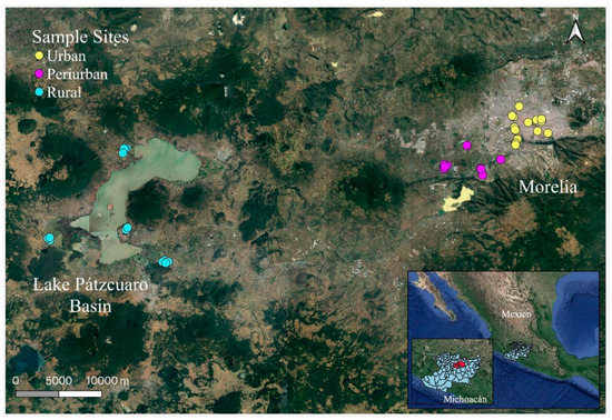 Morelia, a medium-sized city, is the capital of the State of Michoacán. Around 600,000 people live in its metropolitan area [35]. Since the 1980s, it has shown an accelerated and heterogeneous population expansion [36]. The areas adjacent to the city, defined as diffuse urbanization, expanded periphery or peri-urban environments (in this study we will use the latter term) have particular characteristics, forming an imprecise gradient between rural and urban regions [37]. In the selected peri-urban area, crop fields coexist with urban settlements, and the inhabitants lead a mixed way of life. The selected rural area is located approximately 60 km from Morelia, on the shores of Lake Patzcuaro. Four rural centers were included, each with a population of less than 2500 inhabitants and belonging to different municipal entities: San Francisco Uricho (Mun. Erongarícuaro), Tzurumútaro (Mun. Pátzcuaro), San Pedro Cucuchucho (Mun. Tzintzuntzan), and San Andrés Tziróndaro (Mun. Quiroga).