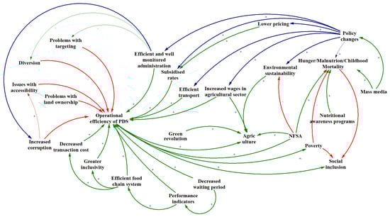 In attempting to dissect the various areas that affect the effectiveness of the PDS and incorporate the involvement of multiple interrelated factors in addressing food security in India, a concept map was created (Figure 2). In the conceptual representation of the factors that determine the national food security, blue arrows signify those factors that can be influenced by policy changes. The red arrows and negative polarity indicate elements that act as barriers while the green arrows and positive polarity specify variables that act as enablers.
