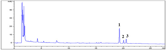 An HPLC-DAD method was applied for the qualitative analysis of ARE. A typical chromatogram of ARE is shown in Figure 1. Main chromatographic peaks 1, 2, and 3 in ARE appeared at retention times of 19.28, 20.06, and 20.55 min, respectively. Comparison of the retention times and UV spectra (249 nm) of these peaks with those of the corresponding standards confirmed the chemical identities of peaks 1, 2, and 3 as ecdysterone, 25R-inokosterone, and 25S-inokosterone, respectively.