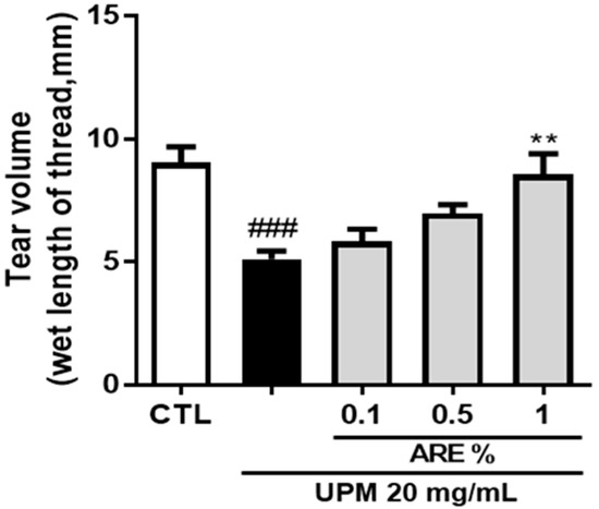 We evaluated the effect of topical administration of ARE on the rat model of UPM-induced DED. As shown in Figure 2, a five-day exposure to UPM caused extreme abrogation of tear production from 9.0 ± 0.6 mm to 5.1 ± 0.3 mm. Subsequently, the tear production was restored on ARE treatment, and significant improvement in tear production was observed in the ARE 1%-treated group (8.5 ± 0.8 mm) than that in the UPM-exposed group. However, no significant improvements in tear production were observed in the ARE-0.1% and ARE-0.5%-treated group.