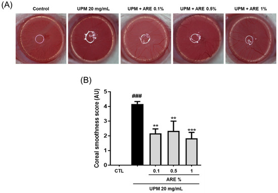 In this study, we identified the protective effect of ARE in an in vivo rat model of UPM-induced DED. The promotion of tear volume is the main therapeutic goal for treating cases of DED. The infiltration of CD4+ T cells into the lacrimal glands or the interruption of neuronal stimulation can decrease tear production [27]. Administration of 1% ARE significantly restored the tear volume in the rat model of UPM-induced DED. Moreover, rats treated with lower doses of ARE showed a tendency for an increase in tear volume (Figure 2). The aqueous layer is the largest portion of the tear film and contains many dissolved growth factors, defense proteins, and anti-inflammatory proteins [28]. Thus, the recovered tear volume following ARE treatment seems to have affected the improvement of corneal irregularity (Figure 3).