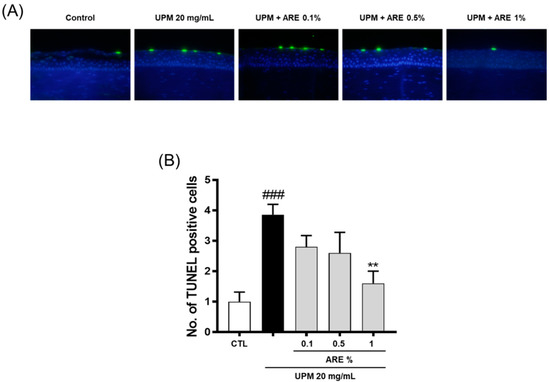 UPM-induced apoptosis of epithelial cells was observed using the TUNEL assay over the corneal surface (Figure 4A). As shown in Figure 4B, the number of TUNEL-positive cells in the UPM-induced DED group was higher than that in the CTL group (CTL, 1.0 ± 0.3; UPM group, 3.9 ± 0.3). UPM-induced apoptosis was significantly reduced in 1%-ARE-treated group (1.6 ± 0.4). However, no significant differences were observed in the UPM-induced apoptosis of corneal epithelial cells in the 0.1- and 0.5%-ARE-treated groups.