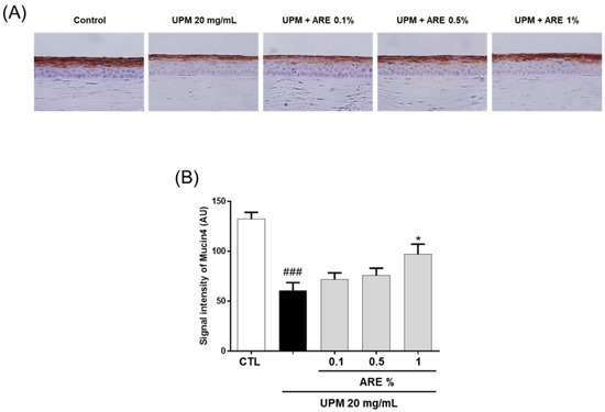 The expression of membrane-bound rMuc4 was analyzed using immunohistochemical staining of the paraffin-embedded corneal sections (Figure 5A). In the UPM group, the expression of rMuc4 was significantly abrogated than that in the CTL group (CTL, 132.8 ± 5.7; UPM group, 60.9 ± 7.0), and this pattern demonstrated significant reversal in the 1% ARE-treated group (97.2 ± 9.1). However, no significant changes were observed in the membrane expression of rMuc4 in the 0.1%- and 0.5%-ARE-treated groups (Figure 5B).