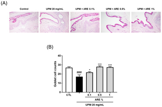 Goblet cells are involved in the production and secretion of soluble type rMuc5AC into the tear film. PAS staining was conducted to measure the goblet cell density in the conjunctival epithelium (Figure 6A). PAS-positive goblet cells were found to be extremely decreased with UPM exposure as compared to that in the CTL group (CTL, 27 ± 0.8; UPM group, 17.2 ± 1.8). However, the goblet cell number was found to be significantly restored in all ARE-treated groups (0.1%, 21.8 ± 0.8; 0.5%, 28 ± 0.9; 1%, 27.5 ± 0.7, Figure 6B).