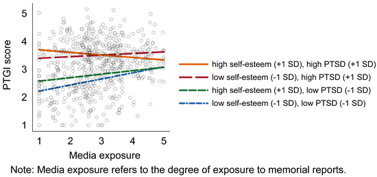 Self-esteem moderated the relationship between media exposure and PTG. Specifically, the relationship between media exposure to post-disaster memorial reports of the 5.12 Wenchuan earthquake and PTG would be stronger for survivors with lower self-esteem than for survivors with higher self-esteem.
