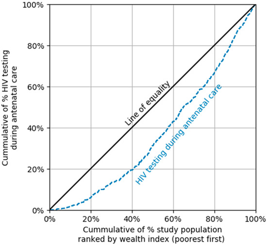 Concentration curve (CC) of HIV testing during antenatal care among women aged 15–49 years who had a live birth in the last two years, by wealth index.