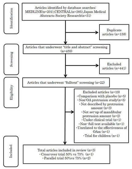 The search identified 617 articles from the database (201 from MEDLINE, 385 from CENTRAL, and 31 from Japan Medical Abstracts Society Research) (Figure 1). After removing 158 duplicates, we conducted a title and abstract search of each study and excluded 441 articles. Twenty-two studies were retrieved for full-text assessment. Nineteen articles were excluded, as in those, comparisons were made with placebo (n = 5), OA protrusion study was absent (n = 5), protrusion amount was not disclosed (n = 3), titrating amount was not set up (n = 2), the study was under clinical trial (n = 1), no full text was available (n = 1), contradicting outcomes were observed (n = 1), and the subjects of the study were children (n = 1). The remaining three publications were included for detailed analysis. Table 1 presents the characteristic of the included studies [5,6,7].