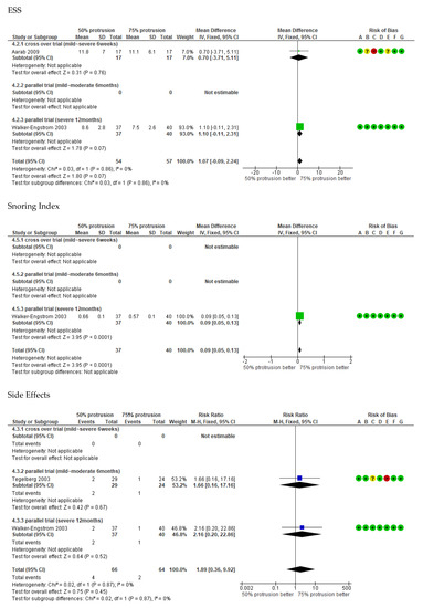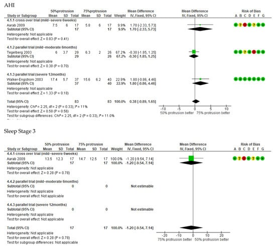 Forest plots showing the mean surrogate outcome differences between 50% protrusion and 75% protrusion in the included studies. The horizontal axis of the forest plot in Sleep Stage 3 is reversed (75%, and 50% protrusion better). Risk of bias legend: (A) Random sequence generation (selection bias), (B) Allocation concealment (selection bias), (C) Blinding of participants and personnel (performance bias), (D) Blinding of outcome assessment (detection bias), (E) Incomplete outcome data (attrition bias), (F) Selective reporting (reporting bias), and (G) Other bias.