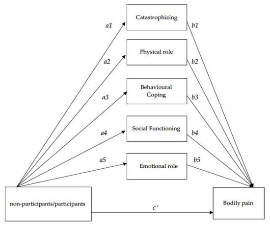 Indirect effect of non-participants/participants on bodily pain through catastrophizing, physical role, behavioural coping, social functioning and emotional role.