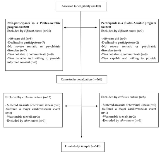 In this study, a cross-sectional design was used, and the sample was selected using a non-proportional quota sampling. The sample size was calculated at a 95% confidence level based on women >60 years old. The total sample was composed of a population consisting of 340 older women. According to the profile of the older women in the present study, 157 were non-participants in any PA program (Mage = 69.9, SD = 7.1) and did not practice any PA supervised by specialists, while 183 were participants and attended a Pilates-aerobic program (Mage = 68.8, SD = 5.3), supervised by specialists (Figure 2). Moreover, the majority of older women lived alone (non-participants = 70.8%, participants = 73.6%) and most of them did not smoke (non-participants = 93.8%, participants = 99.4%). Inclusion criteria for non-participants and participants group in a Pilates-aerobic program in this study were: (1) age >60 years; (2) no severe somatic or psychiatric disorders, or diseases that prevent physical loading; (3) able to communicate; (4) capable and willing to provide informed consent. Specific inclusion criteria for non-participants in a Pilates-aerobic program were: (1) not to be engaged in regular PA > 20 min on > 3 days/week in the last three months. Exclusion criteria for the current cross-sectional study were: (1) acute or terminal illness; (2) had suffered a major cardiovascular event (i.e., myocardial infarction, angina, or stroke) in the past six months; (3) unable to walk; (4) had an unstable cardiovascular disease or other medical condition; (5) had suffered an upper or lower extremity fracture in the past six months; (6) disinclination to complete the study requirements; and (7) the presence of neuromuscular disease or drugs affecting neuromuscular function.