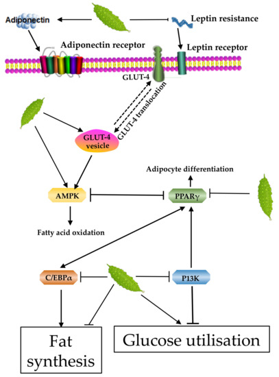 Fat synthesis is considered to be a key step in the development of obesity and regulating this step would effectively control the progression of obesity [89]. Currently, 3T3-L1 adipocytes are the important models used globally for studying the molecular mechanism of adipogenesis. The data showed that the 50% Ethanolic Extract of M. charantia is potent inhibitor of lipogenesis and stimulator of lipolysis in 3T3-L1 pre-adipocytes [90]. In 3T3-L1 cell differentiation studies, it has been found that adipogenesis is a highly elaborate regulatory process that involves a variety of transcription factors, such as C/EBPα and PPARγ) and lipid metabotropic proteins, such as, GluT-4, adiponectin, and leptin) [91,92].