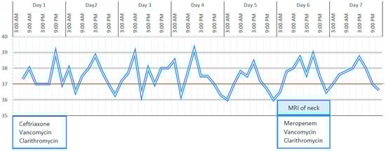 On day 8 of hospitalisation (i.e., 13 days after the onset of symptoms), one dose of intravenous immunoglobulins (IVIG; 2 g/kg) was administered with rapid defervescence (Figure 3), meropenem was stopped once the fever disappeared (i.e., it was administered for 4 days) and acetylsalicylic acid (4 mg/kg/day) was started and continued at home for a total of 8 weeks. Laboratory examinations on day 12 revealed a reduction in the white blood cell count and the levels of inflammatory markers (white blood cell count, 5180/µL; C reactive protein, < 0.4 mg/dL), thrombocytosis (platelets, 548,000/µL), and persistently negative echocardiography. Clinically, we observed a gradual reduction of the right-side neck swelling. Therefore, in our case, deep neck inflammation was associated with KD, which was diagnosed based on the response to immunoglobulin treatment.