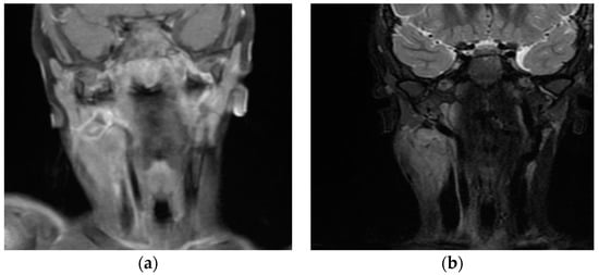 The retropharyngeal abnormalities in KD are presumably linked to the vasculitis of microvessels that cause oedema and inflammation []. In the literature, CT is the imaging study of choice used to identify retropharyngeal abnormalities and to differentiate abscesses from KD inflammation in the majority of cases. The principal findings considered specific for a suppurative complication are ring enhancement, low-density core, soft tissue swelling and mass effects, demonstrating some limitations and a lack of specificity [,]. We performed MRI of the neck to aid in the differential diagnosis. MRI is very useful for the investigation of soft tissues and does not expose the patient to ionizing radiation, although it requires sedation in young or uncooperative children. On the MRI, suppurative lymphadenitis appears as central T1 hypointensity, T2 hyperintensity and peripheral enhancement []. To date, we found limited data in the literature regarding MRI in cervical lymphadenopathy and retropharyngeal involvement in KD. The principal findings reported in four cases were retropharyngeal and upper jugular lymphadenopathy with capsular and hilar enhancement, perinodal and muscular infiltration, a retropharyngeal oedema pattern with contrast enhancement, atlantoaxial effusion and synovial enhancement in the temporomandibular joint [].