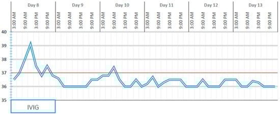 Body temperature from the time of the administration of intravenous immunoglobulin (IVIG) treatment.