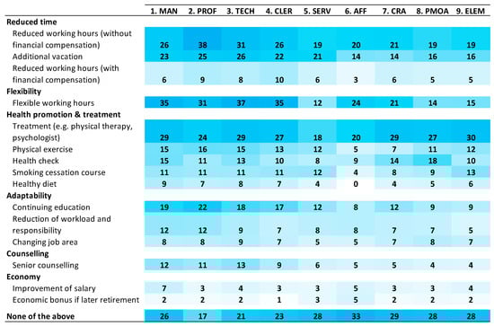 Participants responded to multiple-choice questions about opportunities at the workplace, with fifteen response options provided in random order, e.g., senior counselling, reduction of working hours, flexible working hours, development of competencies, additional days off, reduced workload and responsibility, better salary and health promotion offers []. The option ‘none of the above’ was given at the bottom of the multiple-choice questions as the sixteenth option. All the response options are shown in Table 2.