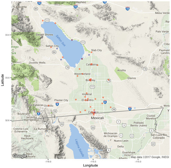 The Imperial Valley is located in Imperial County in California along the US–Mexico Border. The valley consists of a number of small cities and towns mostly surrounded by agricultural land and open desert space. According to the most recent census estimates, approximately 180,000 people live in the county, with more than 80% of residents being of Hispanic origin [8]. The geography of the valley is largely desert landscape, except for the heart of the valley that has been converted for agricultural use. The Salton Sea is at the Northern end of the valley, which is undergoing large environmental changes due to water resource policies that have resulted in a receding water line and large areas of exposed dry shoreline, which may be a new source of airborne particulate matter. The city of Mexicali, Mexico, with over 680,000 residents [9], is located at the Southern end of the valley. The border area near Mexicali experiences heavy and congested traffic; cross-border transport of urban air pollution is a concern for Imperial residents on the US side of the border. Previous research has demonstrated that cross-border air pollution follows the prevailing northwesterly wind flow [10]. The continued growth and industrialization of Mexicali adds to the air pollution of the region. The valley contains a number of potential PM sources, including dust from the desert and Salton Sea beds, as well as local, port of entry, and cross-border mobile emissions, agricultural dust and burning, and industrial activities on both sides of the border.